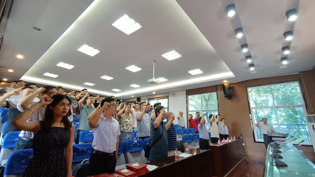 会前,全体党员在学院党委书记欧旭理的带领下重温入党誓词,坚定理想信念。