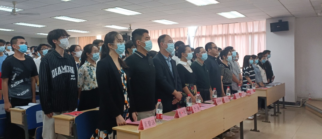 党委副书记马国荣老师、校团委副书记童卡娜老师、学工办郑强伟老师、于谦、周婷、孙瀚、肖碧涵、李嘉、陈一戈老师以及我院学生(研究生)代表参加本次会议。本次会议由李智辉同学主持,大会在庄严的国歌声中拉开帷幕。