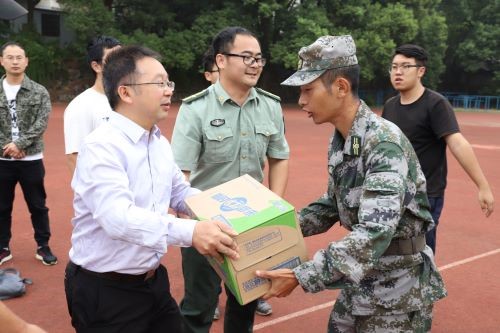 学院领导亲自为新生和教官分发慰问品,并亲切与同学们就学习生活交谈沟通,拉近了学院与新生的距离,彰显出学院对新生的爱护和关怀,让刚远离家乡的新生们感受到了来自学院的温暖。