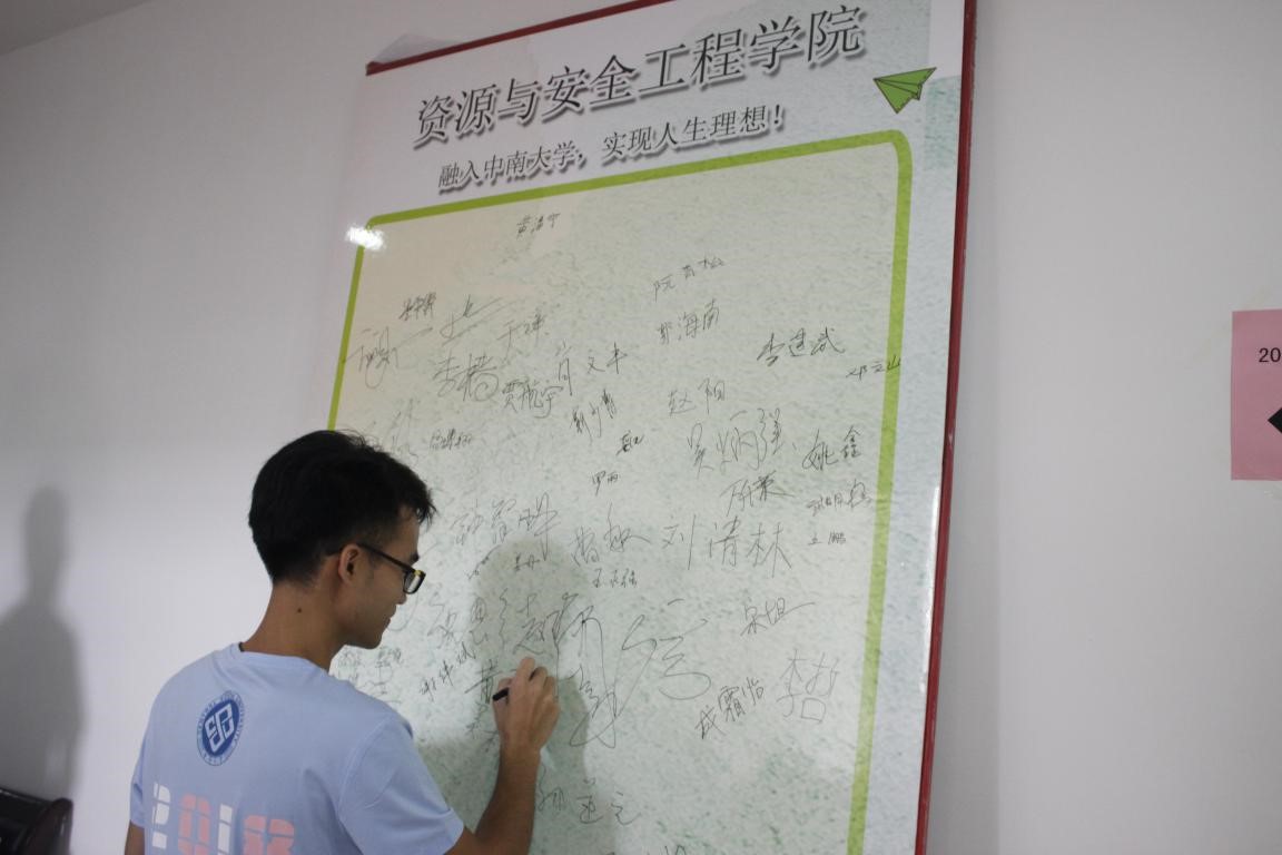 采矿楼222内的报到注册工作有条不紊地进行着,而它的门外也热闹非凡:在采矿楼二楼,新同学们正围着签到板签字留念,假期新生群里的一位位“活跃分子”纷纷在签到板处“显了形”。不远处写有“91网