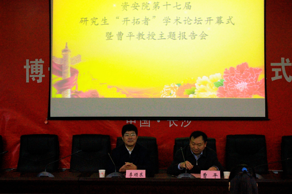 于采矿楼302报告厅举办了第十七届研究生“开拓者”学术论坛开幕式暨曹平教授主题报告会。本次论坛以“为学尚新、唯理崇真”为主题,学院李顺求书记、曹平副院长、研究生辅导员于谦老师出席了此次会议,16级硕士研究生李童同学担任主持,全体16级研究生参加了此次活动。