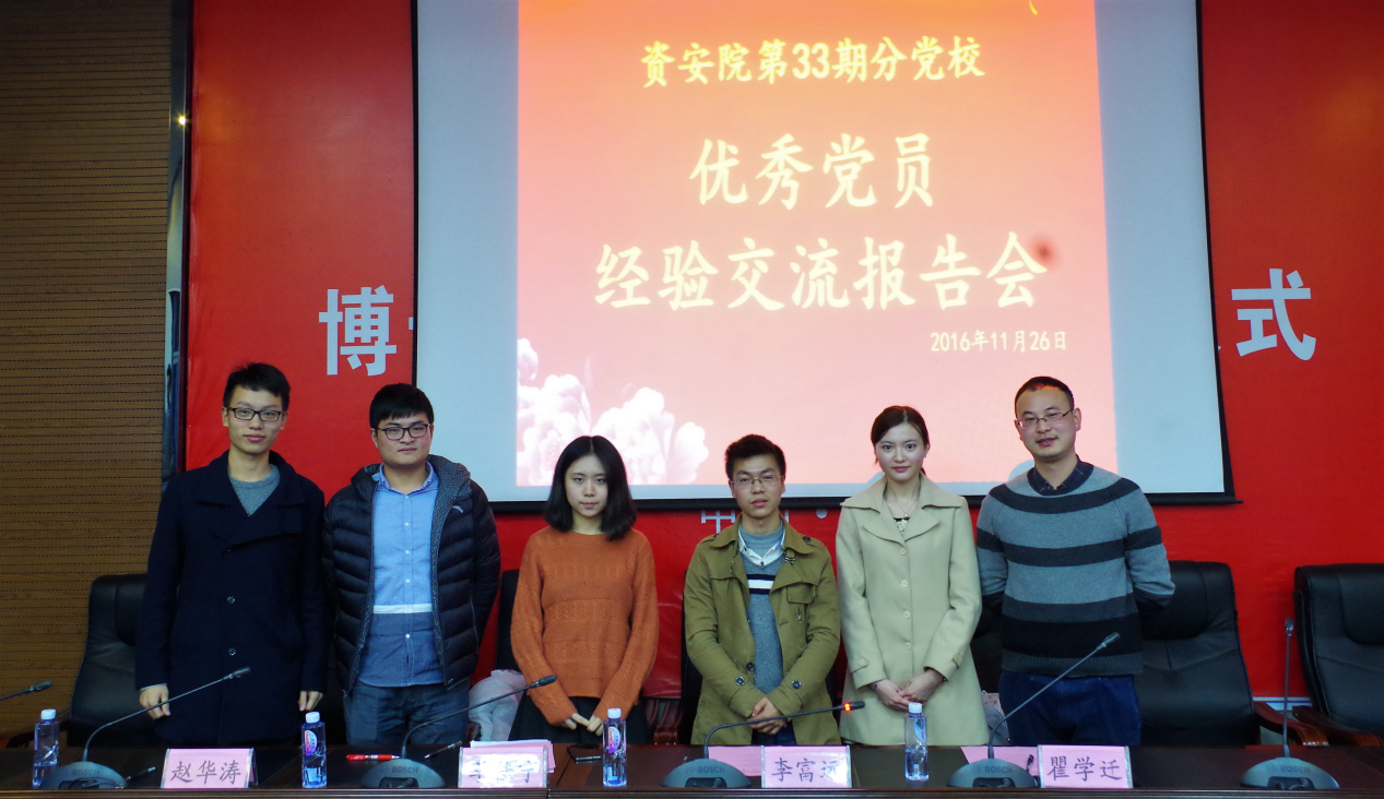 分党校优秀党员报告会于采矿楼举行。此次报告会邀请到了我院优秀学生党员代表城地1303班瞿学迁、采矿1301班李富远、安全1302班李佳宁以及硕士1501班赵华涛来为第33期分党校学员进行经验分享。资安院党委书记李顺求老师、院学工办于谦老师以及16级辅导员侯霄峰老师出席了本次报告会。