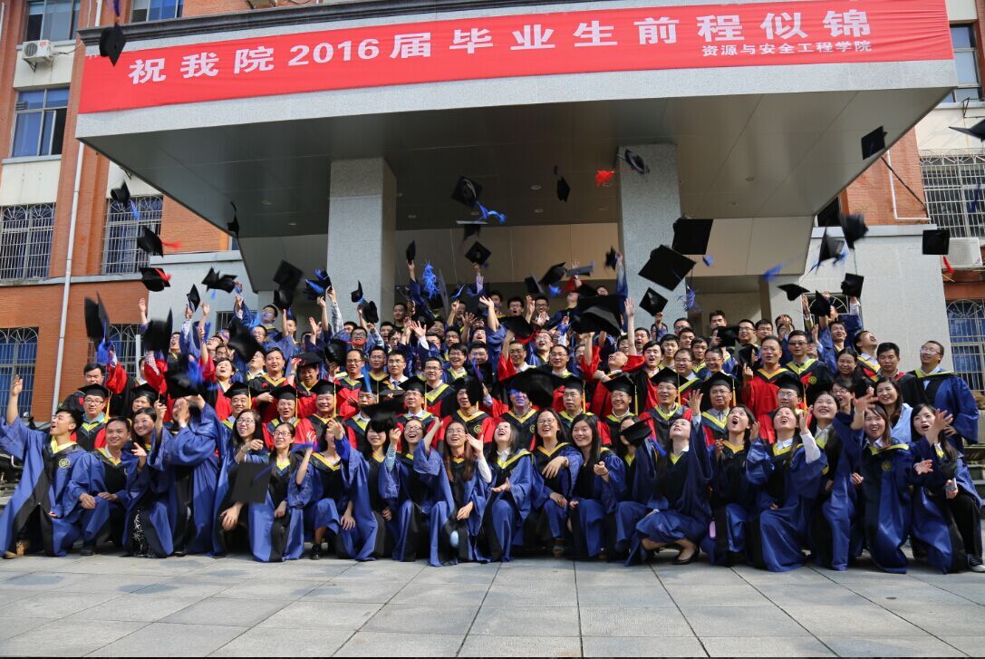 最后,同学们身着学位服依次登上讲台,导师们为他们一一扶正流苏并合影留念。在学位授予仪式结束之后,全体博士、硕士毕业生与学院老师们于采矿楼前坪进行2016届全体毕业生合影留念。在将学士帽抛向天空的那一刻,全体毕业生仿佛挥出了自己扎根母校所付出的汗水,这一刻也意味着他们即将带着对母校的不舍和母校寄予的厚望踏足社会。整体合影结束后,毕业生们自发地以实验室为单位,热情的拉着导师合影留念,不放过任何间隙和任何角落,大家都希望能将对母校的留恋一瞬间全部都埋入心底,刻入胶片中。