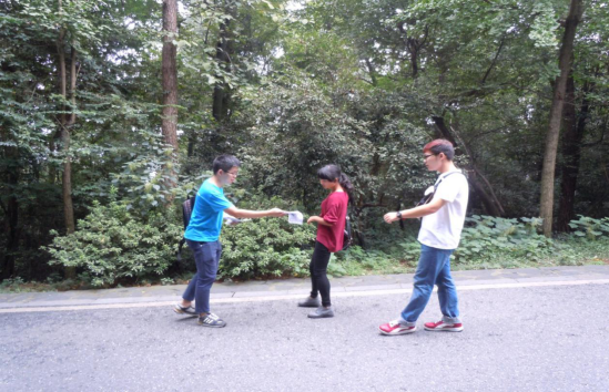 除此之外,硕士1503班党支部还借此机会组织了“一举一动·彰显文明”公益活动,在整个爬山过程中,支部成员向岳麓山游客分发“不乱丢垃圾”的宣传单,然后安排人员在适当位置回收宣传单。大家以身作则,不乱丢垃圾,发现垃圾散落在外面的垃圾及时捡取放进指定位置。