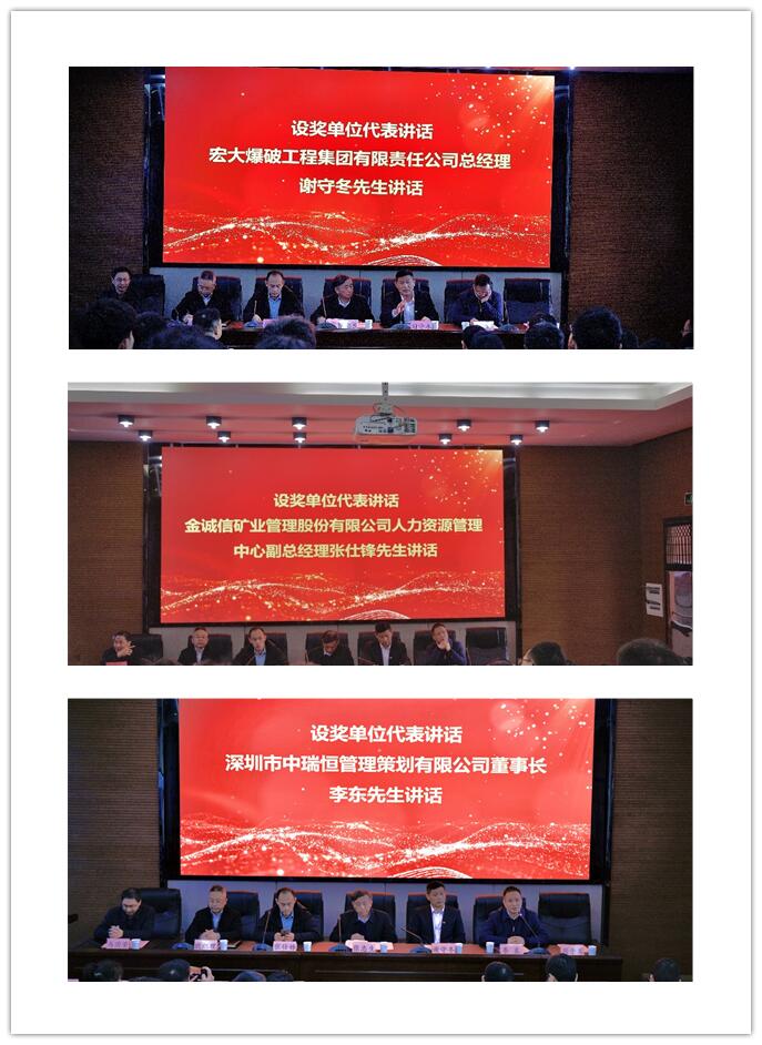 宏大爆破工程集团有限责任公司总经理谢守冬先生、金诚信矿业管理股份有限公司人力资源管理中心副总经理张仕锋先生和深圳市中瑞恒管理策划有限公司董事长李东先生分别代表设奖企业发言。他们首先向所有获奖的学生表达了衷心的祝贺,然后深情地谈到了自己或单位与91网