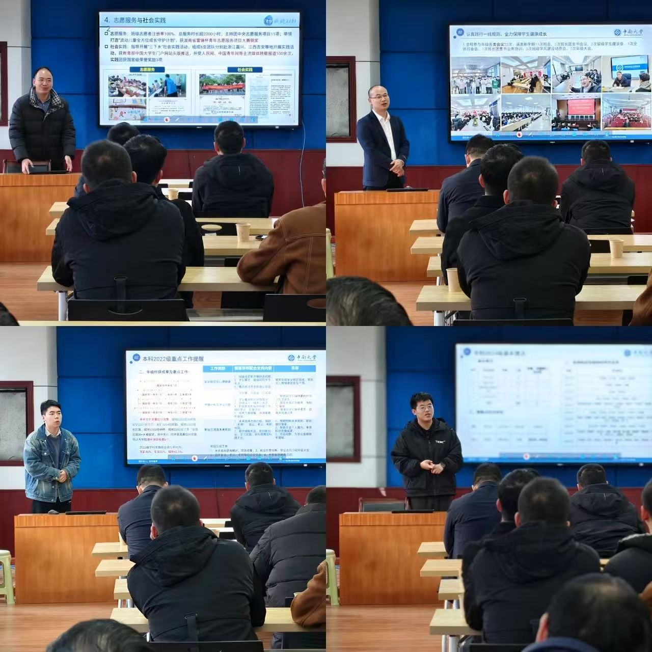 接着,本科生辅导员依次进行汇报。2024级辅导员向奕博提到,要做好学生心理状态摸排,特别是对因心理疾病复学学生和考试挂科学生的关心和疏导;2023级辅导员于谦重点分享了他在年级工作中践行一线规则方面的思考和做法;2022级辅导员陈一戈从工作类别、需要班导师配合支持内容和目标三个方面明确了学期重点任务,同时,他详细报告了2021级就业、考研数据,对毕业季的安全风险、心理危机动态监测、离校全流程闭环管理等方面进行安全管理工作提醒。