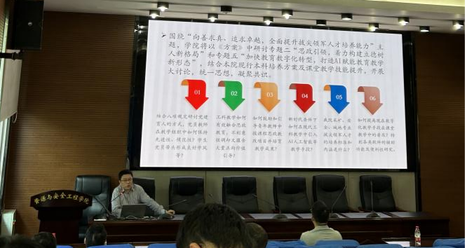 黄锐副院长介绍了本次大讨论的工作小组、讨论内容、具体安排和预期成效。学院正以学校《方案》中研讨专题二“思政引领,着力构建立德树人新格局”和专题五“加快教育数字化转型,打造AI赋能教育教学新形态”开展大讨论,统一思想,凝聚共识。学院领导、教师及机关人员,协力分工,共同培育学院新时代工科人才文化教育和技术进步氛围。